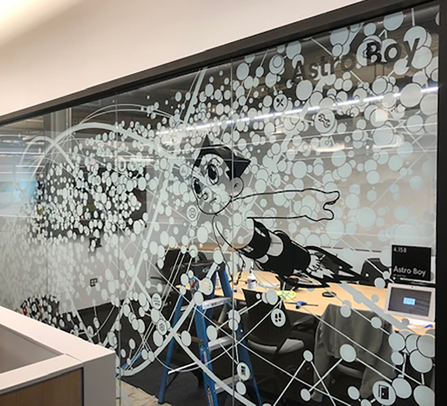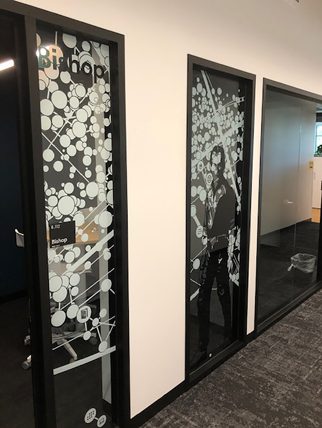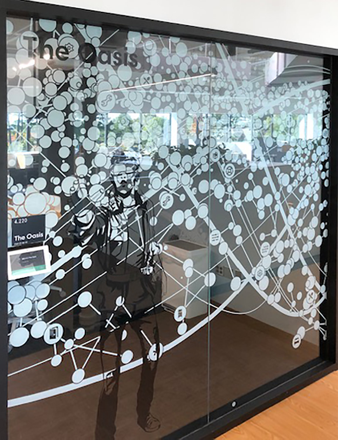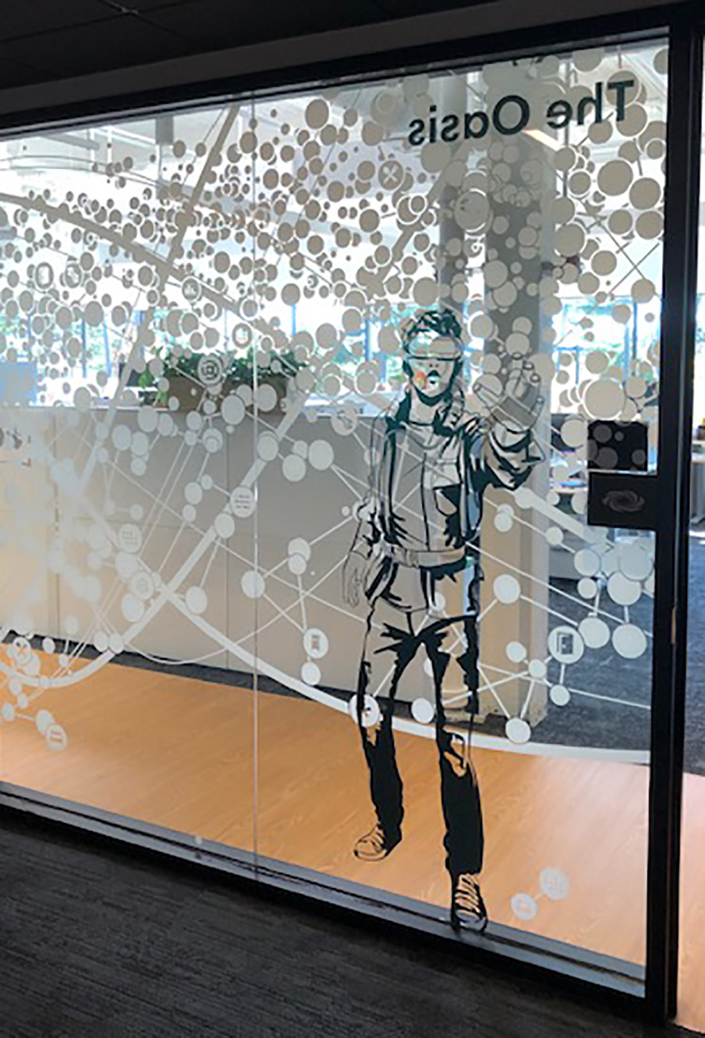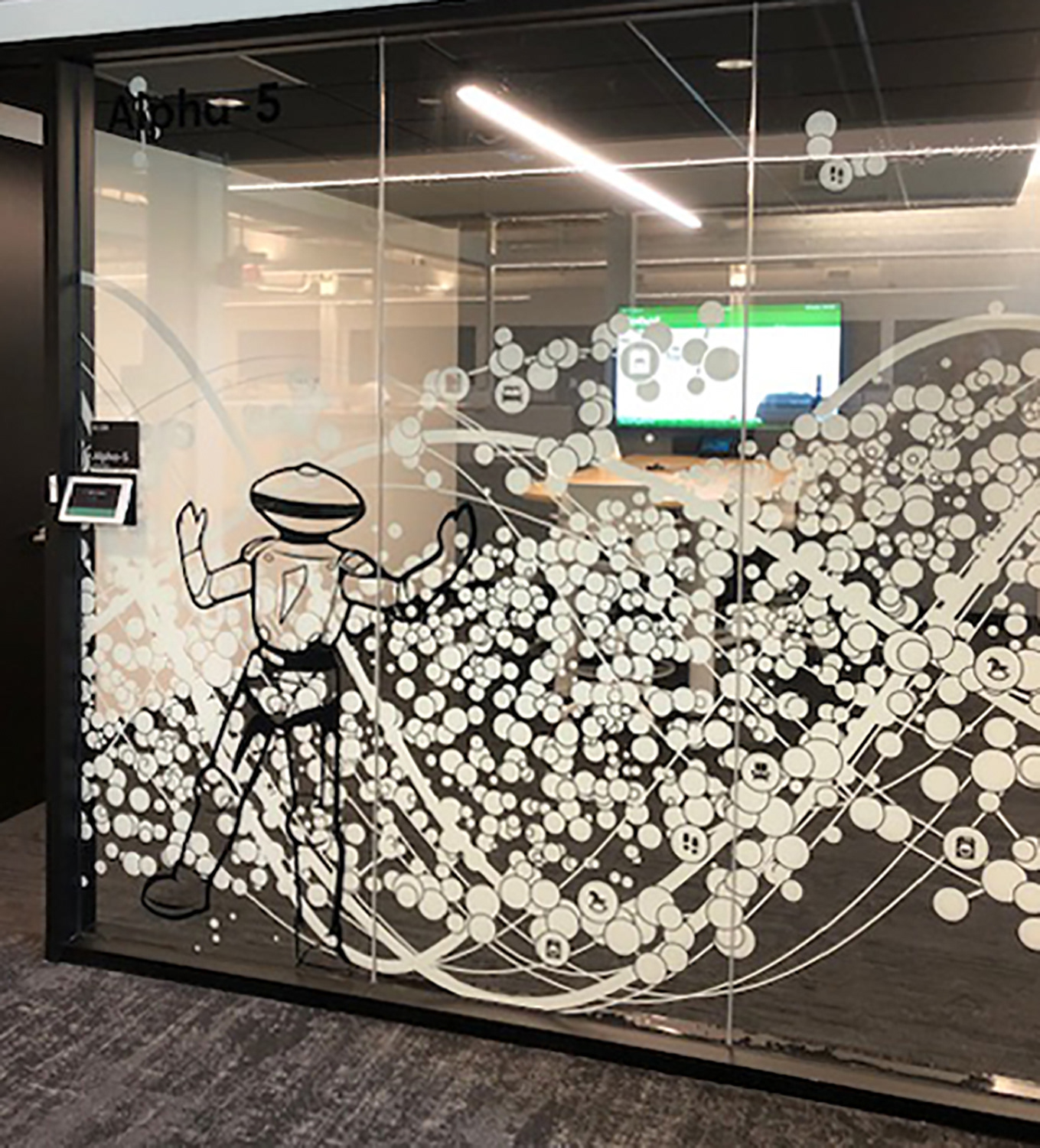 I worked with the branding company and client to illustrate characters to correspond with the room names as part of the glass branding.