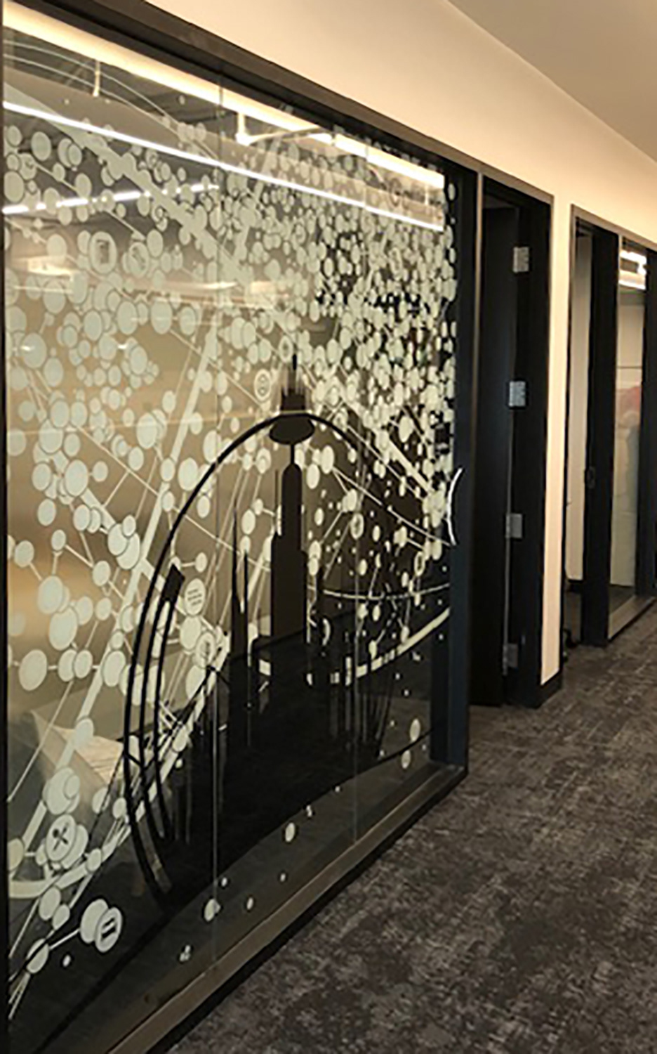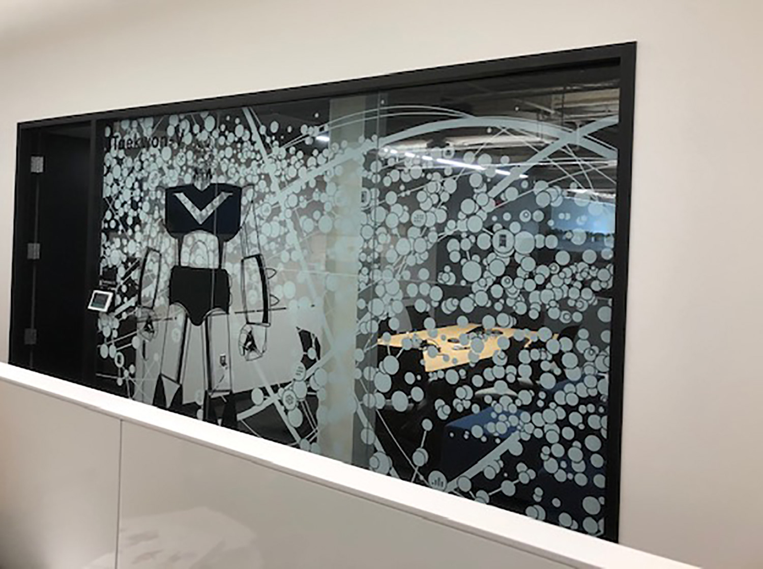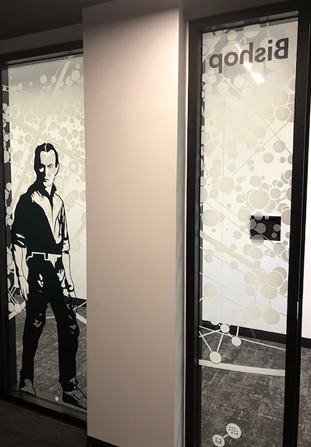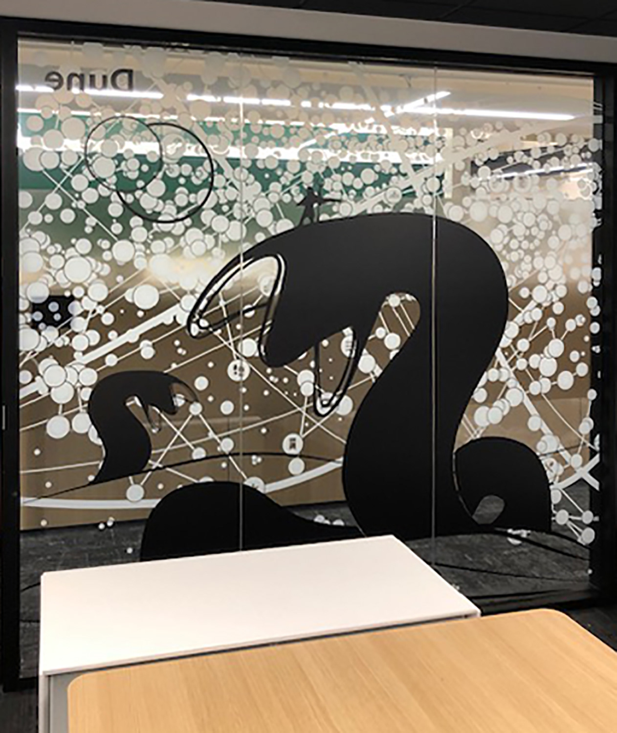 I worked with the branding company and client to illustrate characters to correspond with the room names as part of the glass branding.