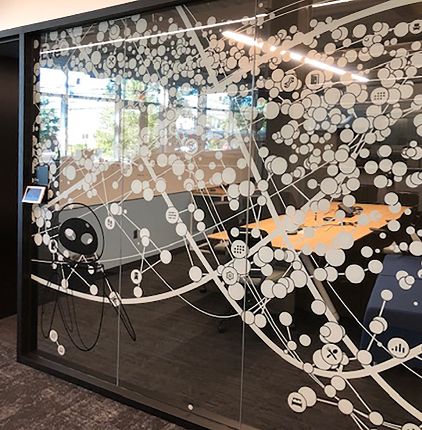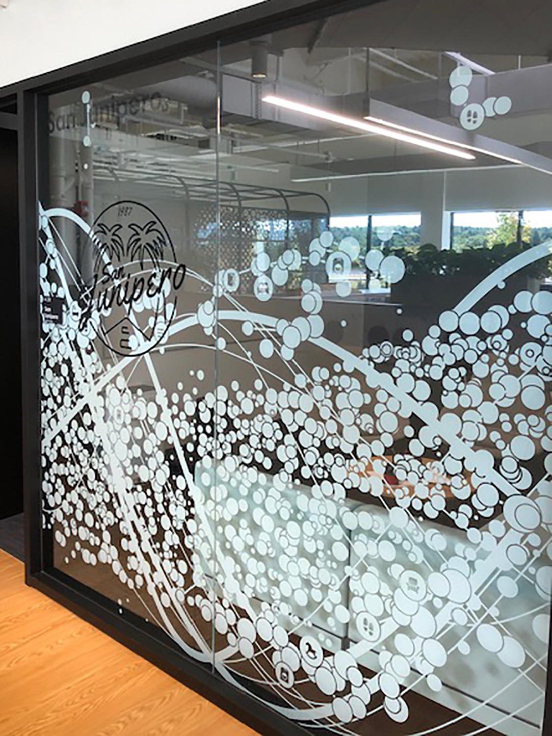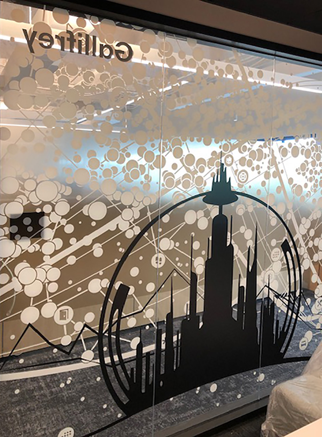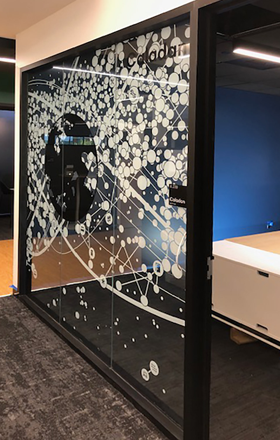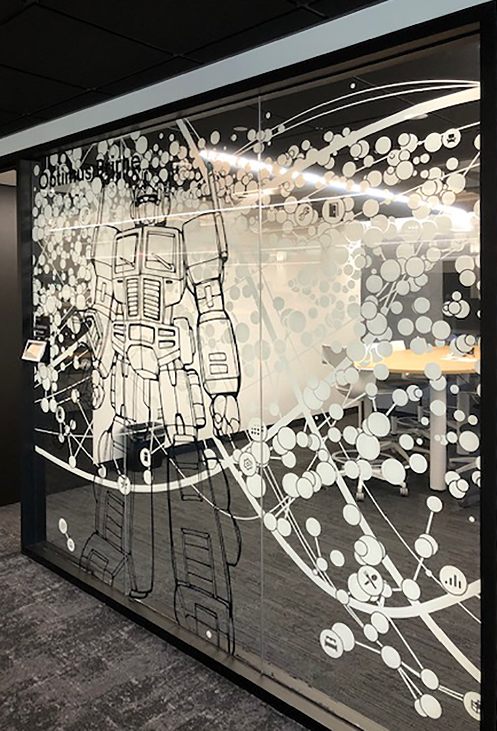 I worked with the branding company and client to illustrate characters to correspond with the room names as part of the glass branding.